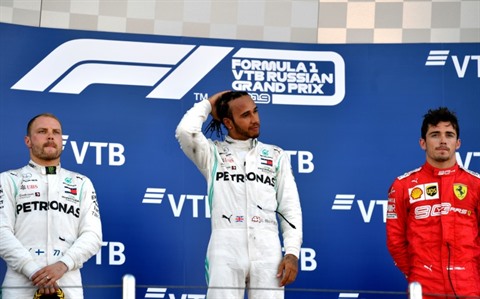 | Lewis Hamilton (centre) remporte le GP de F1 de Russie devant Valtteri Bottas (gauche) et Charles Leclerc, le 29 septembre. |