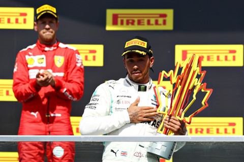| Joie contenue pour Lewis Hamilton, vainqueur, devant Sebastian Vettel, du GP du Canada, le 9 juin à Montréal. |