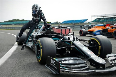 | Le Finlandais Valtteri Bottas (Mercedes) en pole position à Silverstone (Royaume-Uni) pour le GP des 70 ans après avoir réalisé le meilleur temps des qualifications, le 8 août. |