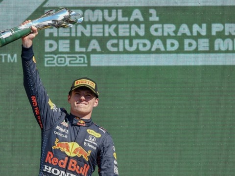 | La joie du Néerlandais Max Verstappen (Red Bull), vainqueur du Grand Prix du Mexique de Formule 1, le 7 novembre sur le podium du circuit des Trois Frères à Mexico. |