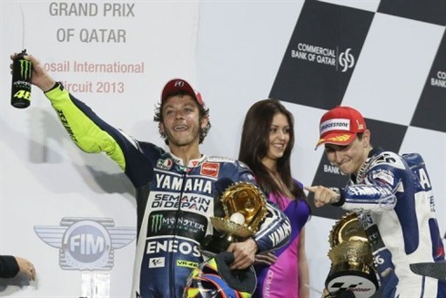 | Le pilote de Yamaha, Jorge Lorenzo (droite), vainqueur du GP de Qatar avec son coéquipier Valentino Rossi, le 7 avril à Doha. Photo : AFP/VNA/CVN |