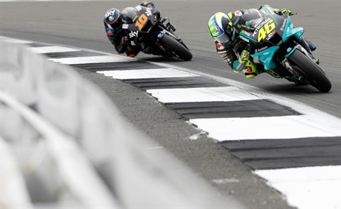 | Les Italiens Valentino Rossi (droite) et Luca Marini lors du GP de Grande-Bretagne de MotoGP, le 29 août à Silvestone. |