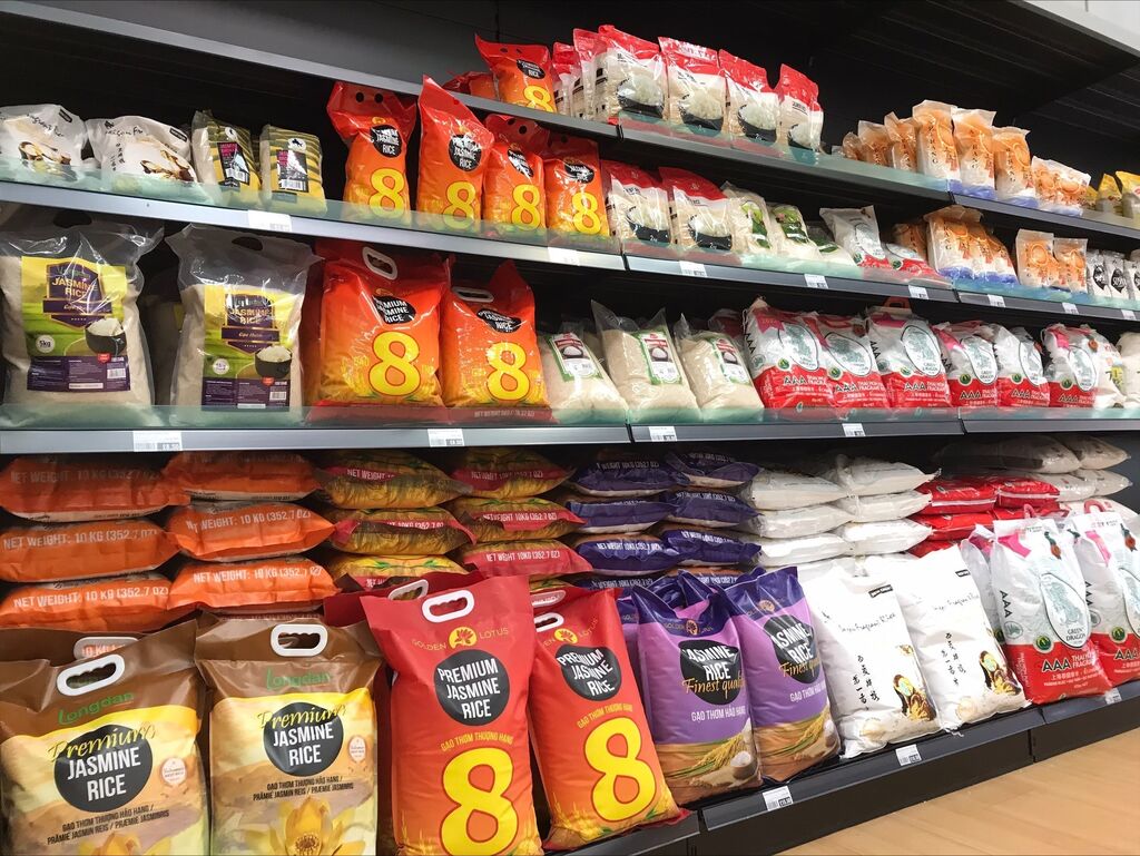 | Riz du Vietnam sont vendus dans un supermarché au Royaume-Uni. |