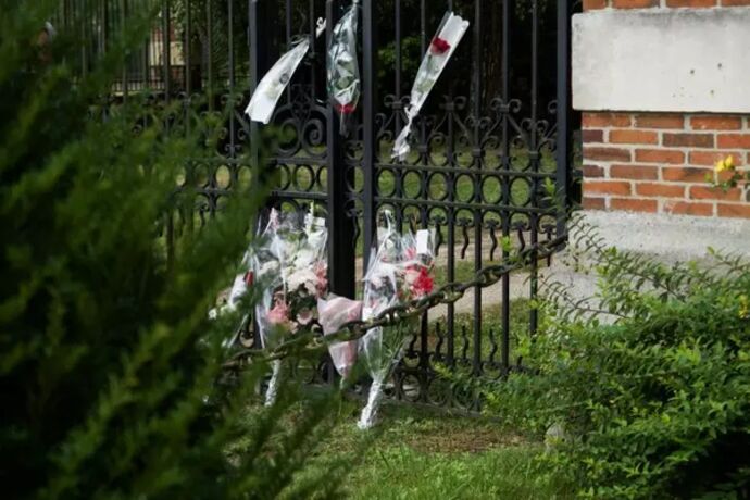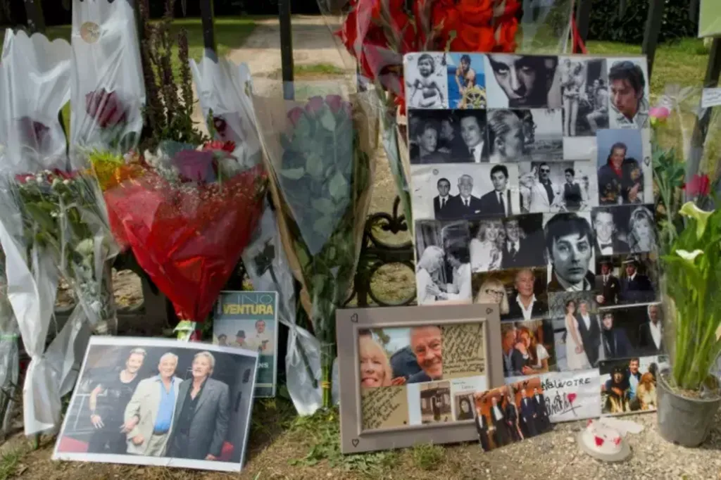 | Des fleurs et des photos d'Alain Delon déposées par des admirateurs à l'entrée de la propriété de l'acteur décédé, le 19 août à Douchy, dans le Loiret. |