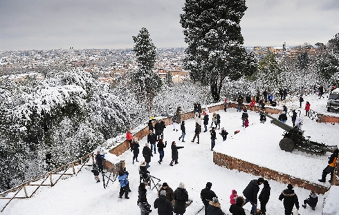 | Forte chute de neige dans la colline du Gianicolo, en Italie. |
