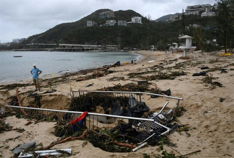 | Une plage de Deep Water Bay envahie de débris après le passage du typhon Mangkhut, le 17 septembre à Hong Kong. |