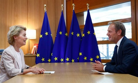 | La ministre allemande Ursula von der Leyen, candidate à la présidence de la Commission, rencontrant le Président du Conseil européen Donald Tusk, le 4 juillet à Bruxelles. |