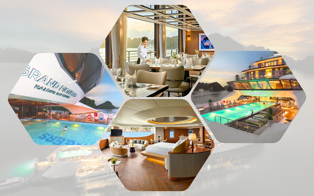 • Modernité : La flotte de super yachts Grand Pioneers est équipée d’un système BMS (Building Management System - Système de gestion de bâtiment) permettant une gestion optimisée en réduisant le nombre de personnel chargé de manœuvrer le navire. Ce système se régule automatiquement en fonction des conditions environnementales et permet de réduire la consommation d’énergie générée par le système de climatisation. Ce duo de yachts est considéré comme la fierté de la construction navale vietnamienne, puisqu’ils ont été entièrement fabriqués par la société de construction navale de Ha Long. Longs de 109,99 m et larges de 18,68 m, les navires Grand Pioneers, capables de transporter 320 personnes chacun, sont actuellement les deux plus grands navires de croisière du pays, en mesure de naviguer dans les zones littorales des eaux territoriales du Vietnam.