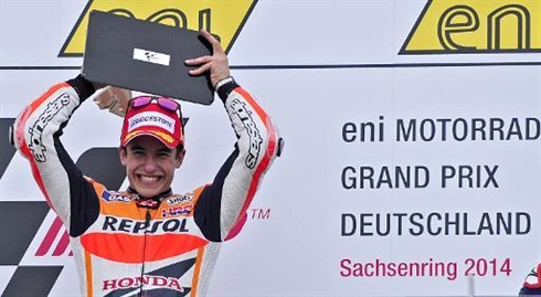| Le pilote Marc Marquez vainqueur du Grand Prix d'Allemagne en catégrorie motoGP, le 13 juillet sur le circuit de Sachsenring à Hohenstein-Ernstthal. |