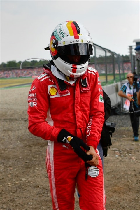 | L'Allemand Sebastian Vettel déçu après son abandon lors du Grand Prix d'Allemagne, le 22 juillet à Hockenheim. |