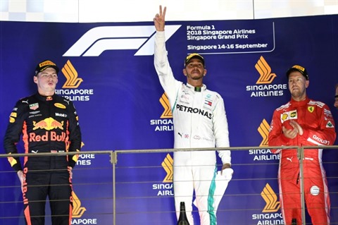 | Le Britannique Lewis Hamilton (centre) remporte le GP de Singapour devant Max Verstappen (gauche) et Sebastian Vettel le 16 septembre. |