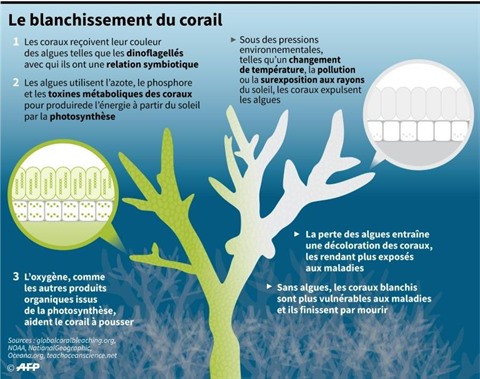 La Grande Barrière de corail a déjà connu trois épisodes de blanchissement en cinq ans alors que la moitié des coraux ont disparu, depuis 1995, en raison de la hausse de la température de l'eau. Le blanchissement est un phénomène de dépérissement qui se traduit par une décoloration.