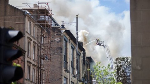 | Le bâtiment Charles Rennie Mackintosh, abritant la Glasgow School of Art à Glasgow, en Écosse, avait déjà été ravagé par un incendie le 23 mai 2014. |
