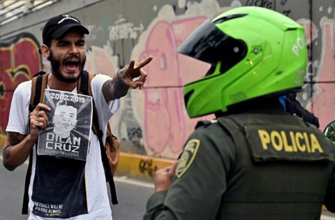 | Manifestation en mémoire de Dilan Cruz mort des suite d'un tir de la police à Cali dans le Centre-Ouest de la Colombie le 27 novembre 2019. |