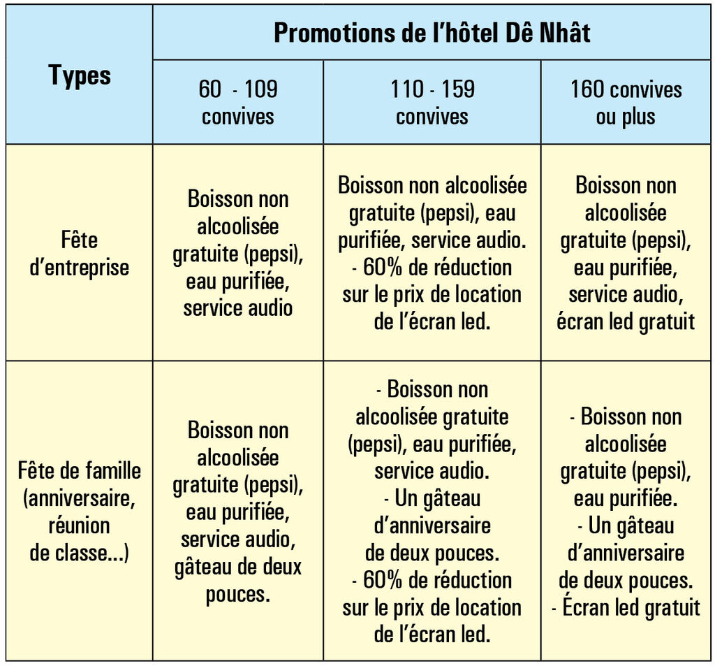 L’offre s’applique au menu de fête à partir de 3.500.000 dôngs/table ou plus. Elle n’est pas applicable en même temps que le programme de mariage.
