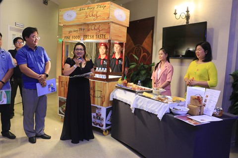| Lâm Thuy Ai (au micro), vice-présidente du Club d’entrepreneurs de Tiên Giang, présente le profile d’une des entreprises membres. |