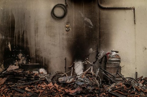 | Mur extérieur d'une maison détruite par un incendie dans le village de Kastri, sur l'île grecque d'Eubée, le 10 août. |
