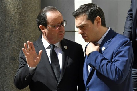 | Le Premier ministre grec Alexis Tsipras, au côté de François Hollande, alors président de la République française, lors d'un sommet entre leaders européens, à Rome, le 25 mars. |