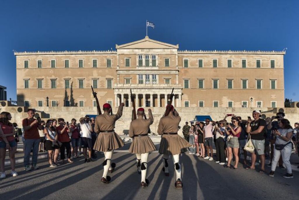 | Des soldats de la garde présidentielle marchent lors d'une relève devant le parlement grec, à Athènes, le 24 juin. |