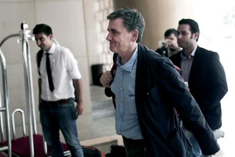 | Le ministre grec des Finances, Euclid Tsakalotos (centre), avant une réunion avec le Fonds monétaire international (FMI), le 9 août à Athènes |