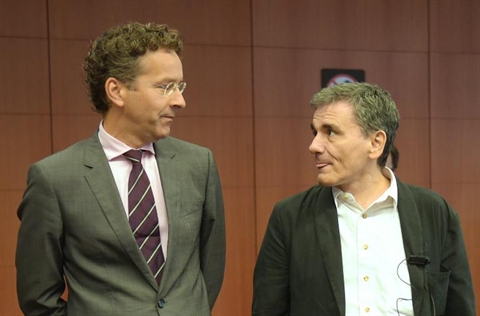 | Le ministre grec des Romances, Euclid Tsakalotos (droite) et le président de l'Eurogroupe Jeroen Dijsselbloem lors d'un meeting à Bruxelles, le 14 août. |