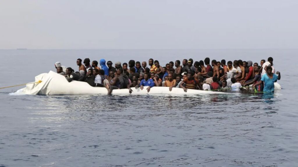 | Une embarcation pneumatique surchargée de migrants en mer Méditerranée. |