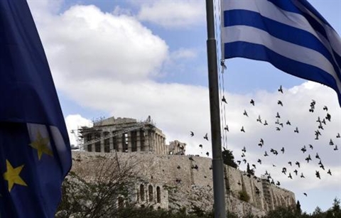| Le drapeau grec et le drapeau européen à Athènes, le 19 février 2015. |