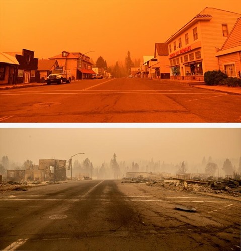 | Cette juxtaposition de deux photos montre le centre de Greenville (Californie) avant le passage de l'incendie, le 23 juillet (haut), puis après, le 4 août (bas). |