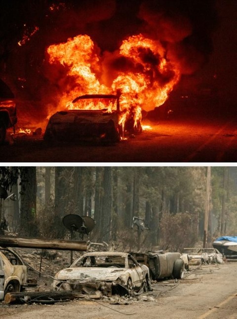 | Cette juxtaposition de deux photos montre une voiture en train d'exploser sous l'effet des flammes du Dixie Fire le 24 juillet (haut), puis sa carcasse calcinée le 7 août (bas). |