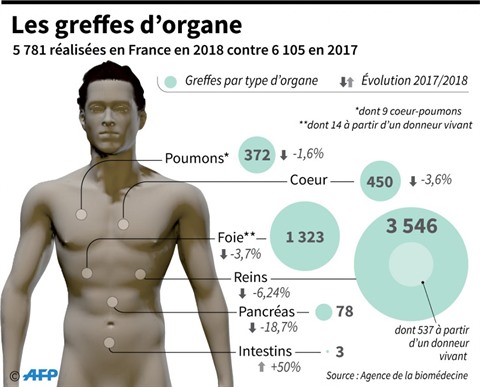 | Évolution du nombre de greffes d'organe en France (2017-2018). |