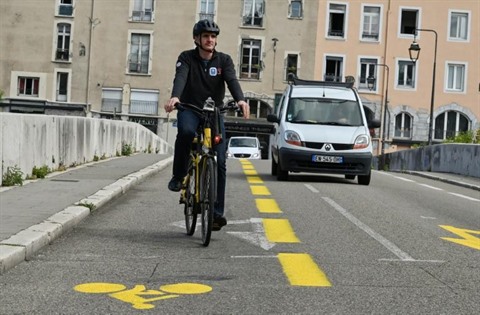 | Le maire de Grenoble, Eric Piolle, d'Europe Ecologie Les Verts (EELV), roule sur une piste cyclable temporaire, à Grenoble le 6 mai. |