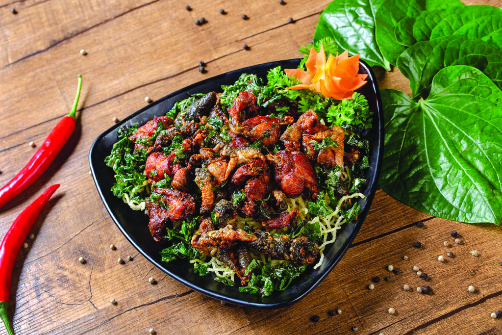 - Présenter la sauce chili dans un bol et la viande de grenouille frite et les feuilles de piper lolot frites dans une assiette. Servir chaud !