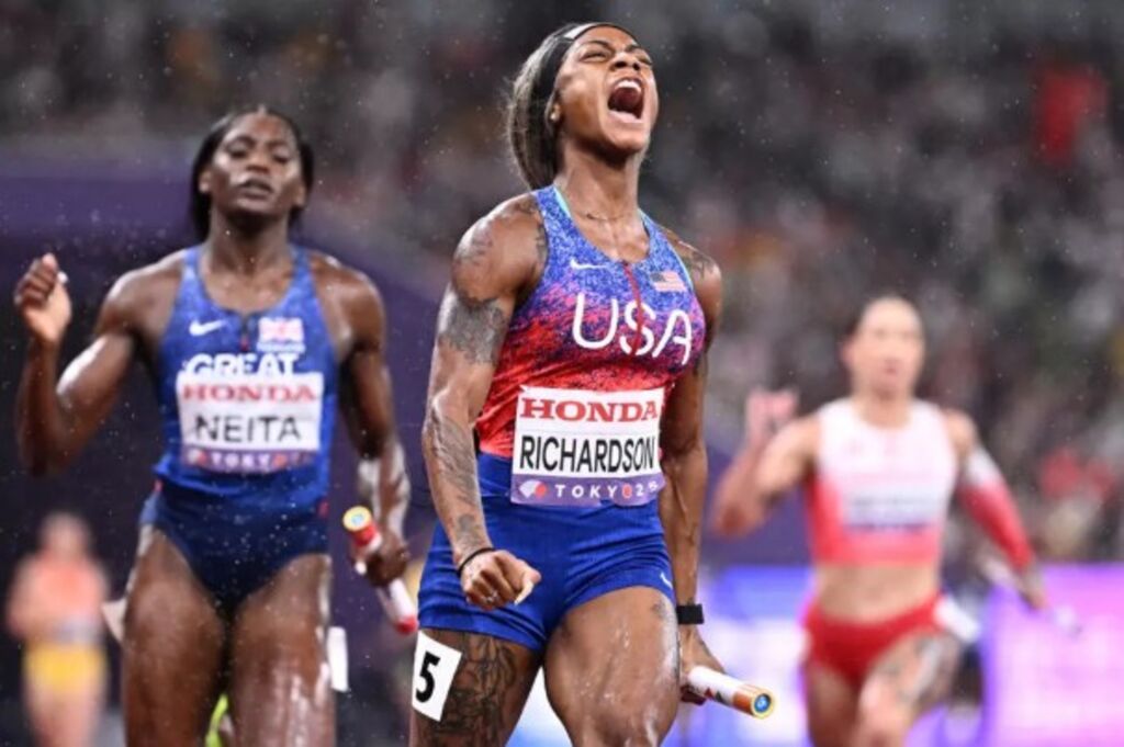 | L'Américaine Sha'carri Richardson exulte après avoir remporté le relais 4x100 m avec son équipe, aux Mondiaux de Tokyo, le 21 septembre. |