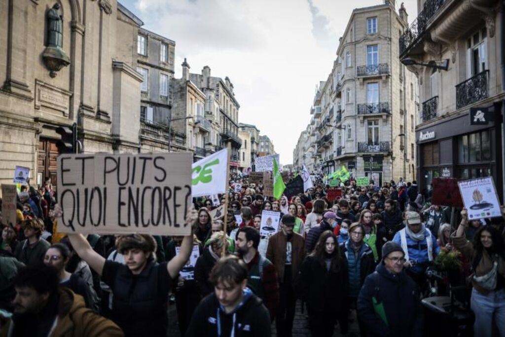 | Des manifestants réclament l'arrêt d'un projet de huit nouveaux forages pétroliers près d'Arcachon, le 11 février à Bordeaux. |