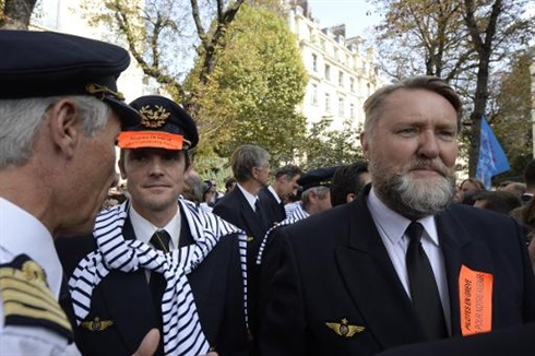 Pour la première fois depuis le début du conflit, des grévistes sont descendus dans la rue pour exprimer leurs craintes de délocalisations. Entre 200 et 300 pilotes ont répondu à l'appel des syndicats, en uniforme bleu marine, casquette et pulls marinières "made in France" sur les épaules, derrière une banderole "sauvegardons l'emploi français".