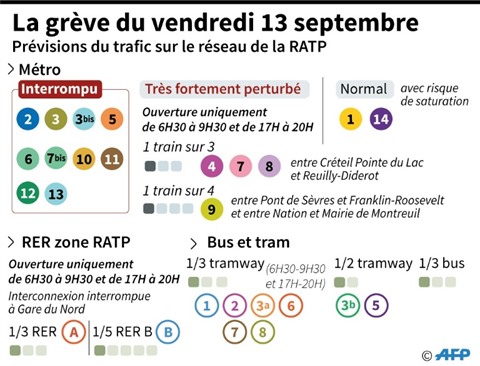 Vendredi soir 13 septembre après 20h00, seules les métros des deux lignes automatiques 1 et 14 doivent circuler. Le trafic doit reprendre normalement à 05h30 samedi 14 septembre, selon la RATP.