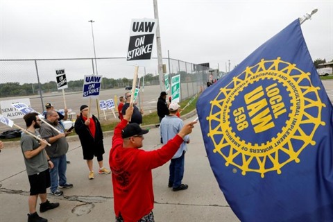 | Des membres du syndicat UAW manifestent aux abords d'une usine General Motors à Flint, le 16 septembre dans le Michigan. |
