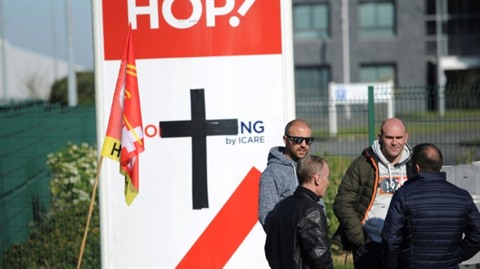 | Une croix noire a été peinte sur le logo de Hop ! à l'entrée de l'aéroport de Morlaix, dans l'Ouest de la France, le 7 avril. |