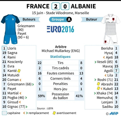 La rentrée de Griezmann (68e) a elle totalement reboosté l'attaque et le joueur de l'Atletico Madrid, apparu émoussé face aux Roumains, a libéré les siens en ouvrant la marque. Son Euro est enfin lancé alors que Payet, qui a doublé la mise, est bel et bien le grand bonhomme de ce début de compétition côté français.