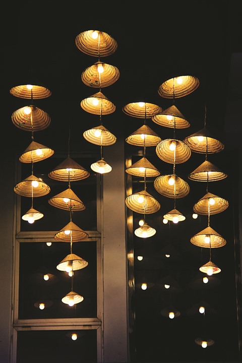 Le photographe a également sélectionné quelques images de scènes de vie, imprimées dans de petits formats. Il veut ainsi rappeler qu’au Vietnam il y a toujours (ou presque) foule partout, ce qui est vraiment spécifique au pays. Alors, on retrouve dans cette "Balade vietnamienne" ces lignes qu’il aime tant (photos de stores, de rideaux, de fenêtres, de fils électriques, de façades…) mais aussi des photos très colorées comme cette scène de marché absolument sublime ou cette suspension à base de chapeaux coniques typiquement vietnamiens.