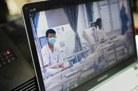 | Des images tirées d'une vidéo des enfants thaïlandais sauvés de la grotte recevant des soins dans un hôpital, projetées lors d'une conférence de presse à Mae Sai, le 11 juillet. |