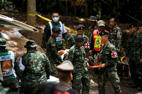 | Des soldats et des secouristes s'exercent le 4 juillet dans le cadre des opérations de secours pour 12 jeunes joueurs de football et leur entraîneur bloqués dans une grotte en Thaïlande. |