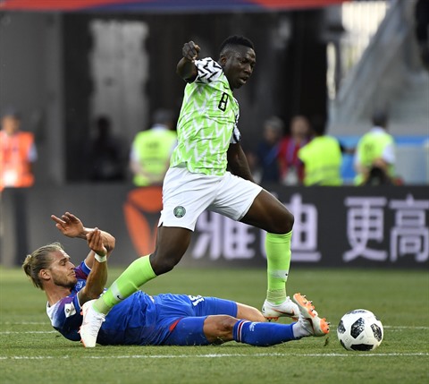 | Le buteur nigérian Ahmed Musa a signé un doublé spectaculaire contre l'Islande dans le groupe D du Mondial-2018 à Volgograd, le 22 juin. |