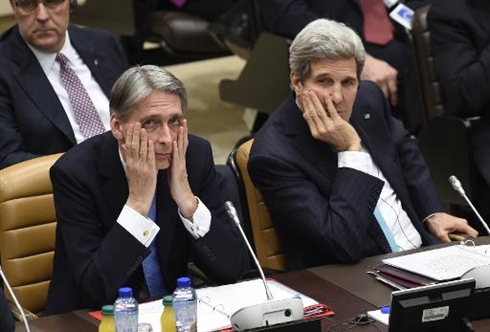 | Le ministre britannique des Affaires étrangères Philip Hammond (gauche) et le secrétaire d'État américain américain John Kerry le 2 décembre à Bruxelles. |