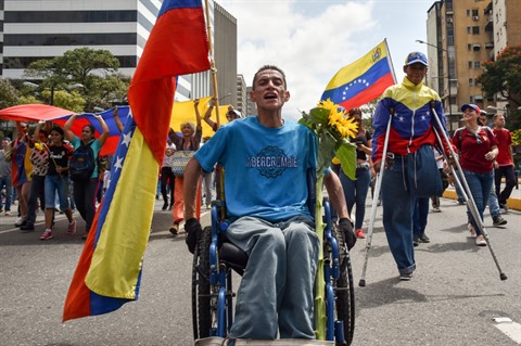 | Des partisans du président autoproclamé vénézuelien Juan Guaido manifestent à Caracas le 9 mars 2019. |