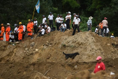 | Des secouristes, pompiers et habitants sur les lieux d'un glissement de terrain à Santa Catarina Pinula, à 15 km à l'Est de Guatemala, le 2 octobre. |