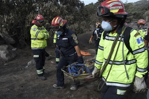 | Des sauveteurs portent le corps d'une victime du Volcan de Feu dans le village de San Miguel Los Lotes, au sud-ouest de Guatemala City, le 6 juin |