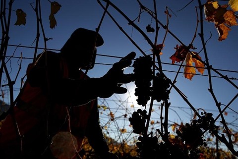 | Un ouvrier agricole participe aux vendanges à Kenwood, en Californie (Ouest). |