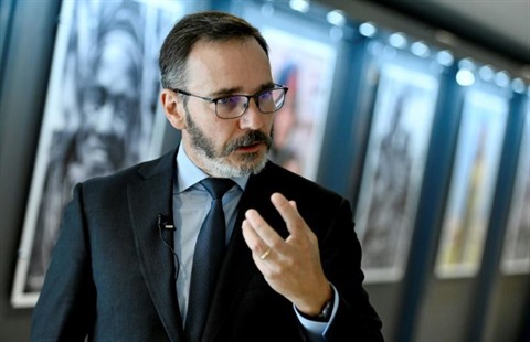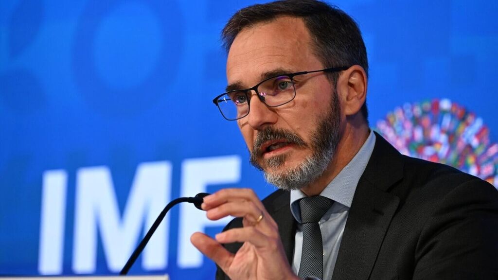 | Le chef économiste du FMI, Pierre-Olivier Gourinchas, lors d'une conférence de presse au siège du FMI à Washington, le 11 octobre. |
