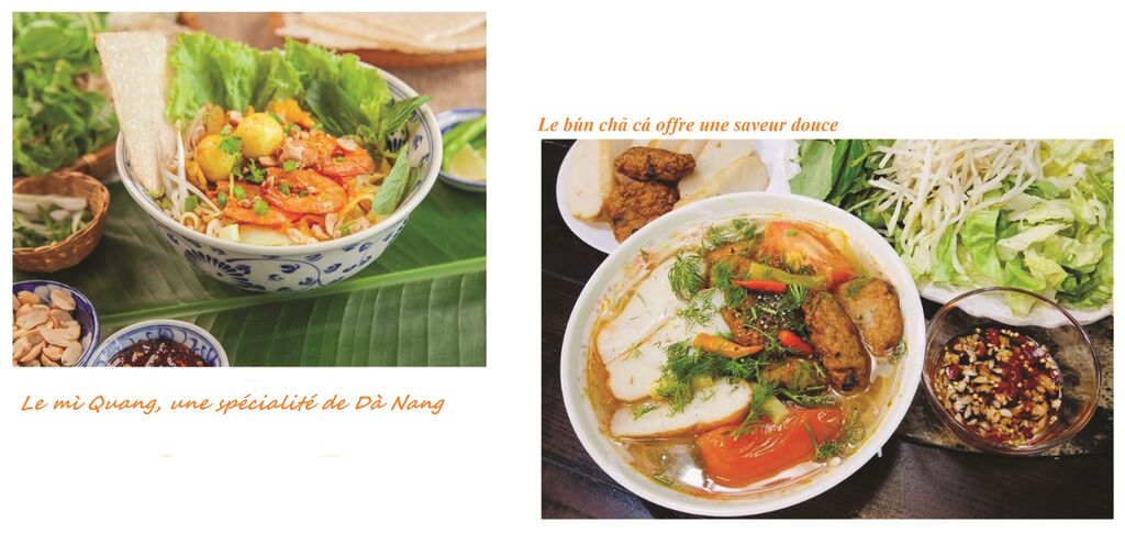 Parmi les plats incontournables à déguster à Dà Nang, le Guide Michelin recommande le mì Quang (nouilles de Quang) et le bún chả cá (vermicelles aux galettes de poissons). Le mì Quang est un plat emblématique de cette ville et de la province voisine de Quang Nam, composé de nouilles de riz jaunes accompagnées d’un bouillon léger mais riche, parfumé à la viande, et servi avec des herbes fraîches comme la laitue, la coriandre et la ciboule. Il existe de nombreuses variantes du mì Quang, avec des garnitures telles que crevettes, de viande de porc, poulet, grenouille ou poisson. Ce plat peut être dégusté à toute heure de la journée.